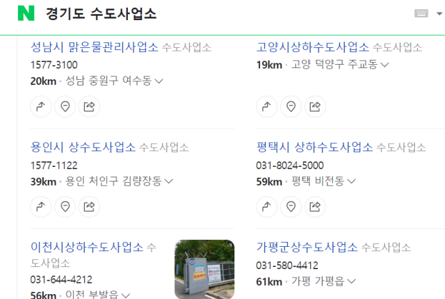 네이버에서 '경기도 수도사업소'로 검색합니다. 아래와 같은 검색 결과를 찾을 수 있습니다. 해당 지역에 전화를 걸어 문의하시면 됩니다.