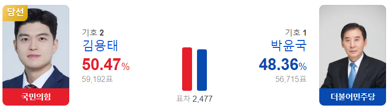 포천가평 개표 결과, 국민의힘 김용태 후보가 50.47%의 득표를 받아 국회의원으로 당선되었습니다.