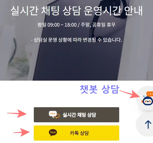 실시간 채팅상담은 평일 9시부터 18시까지 운영되고 주말과 공휴일은 휴무입니다. 아래 이미지를 클릭하면 실시간 채팅상담 화면으로 바로 이동할 수 있어요.