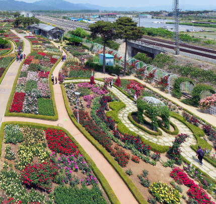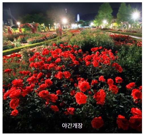 장미뿐만 아니라 연못, 분수, 미로원, 야외공원, 파고라 등 다양한 조경과 시설을 갖추고 있습니다. 다양하고 독특한 여러 장미품종을 정성을 들여 관리하여 장미축제 기간뿐만 아니라 5~11월 계속해서 장미를 감상할 수 있습니다.