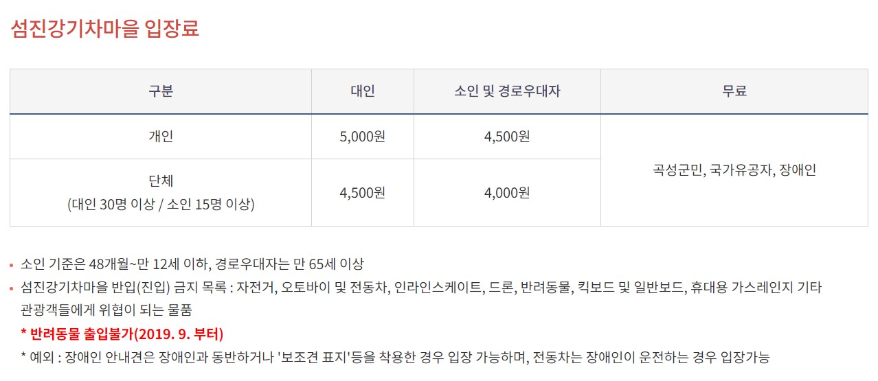 이상의 입장료 및 요금표는 곡성문화관광 홈페이지를 참고하여 작성되었으며 이후 변동될 수 있음을 참고해 주시기 바랍니다.