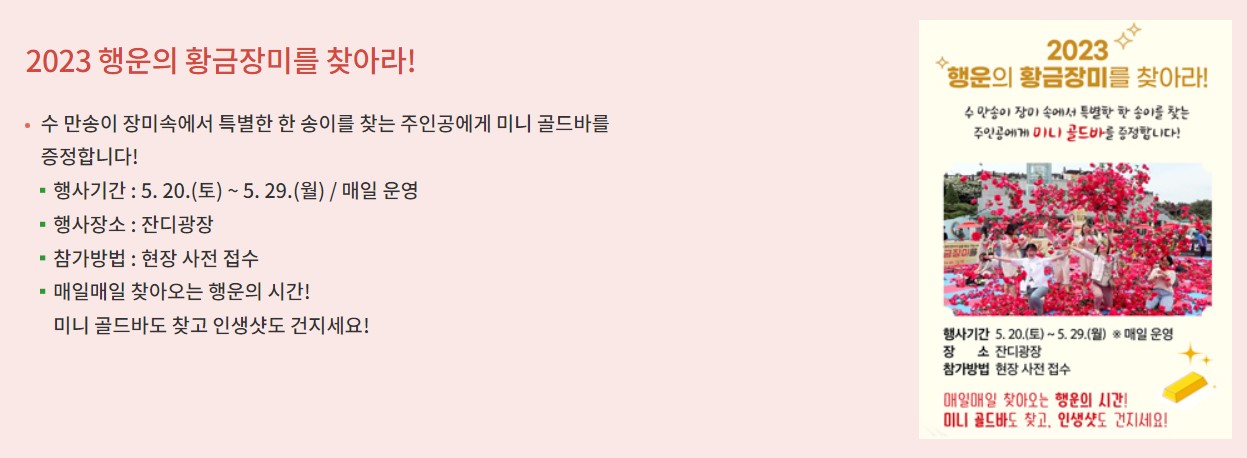수 만 송이 장미 중에서 특별한 한 송이를 찾아라! 그 한송이를 찾는 사람에게 미니골드바를 증정합니다! 축제기간 매일 운영하며 잔디광장에서 행사가 이루어집니다. 현장 사전 접수를 한 후에 참가할 수 있습니다. 매일매일 참가 가능하며 매일 기회가 있습니다. 매일 찾아오는 행운을 찾아서 미니골드바를 받는 주인공도 되고 인생샷도 건지세요.