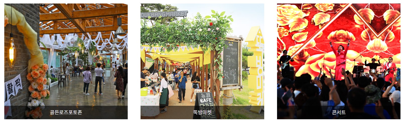 골든로즈포토존, 뚝방마켓, 콘서트, 야간개장, 로즈 왈츠 파티 등 다양한 행사와 이벤트가 펼쳐집니다.
