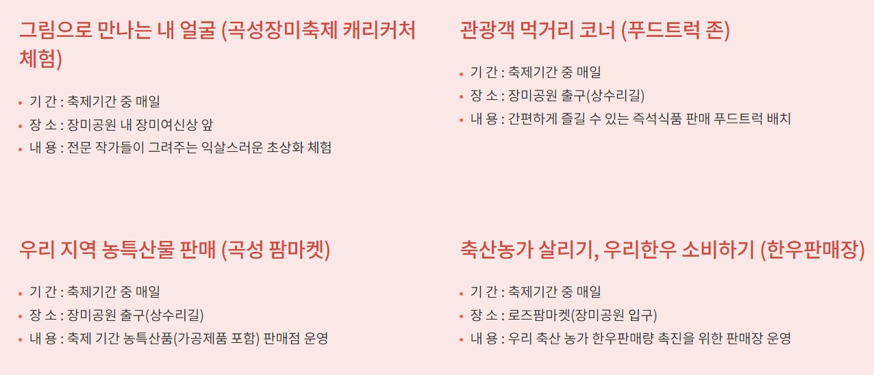 장미공원 내 장미여신상 앞에서는 전문 작가들이 그려주는 익살스러운 초상화(캐리커처) 체험을 할 수 있습니다. 또한 장미공원 출구(상수리길)에 푸드트럭 존이 배치됩니다. 인생샷도 건지고 푸드트럭존에서 허기도 달래고~. 푸드트럭 존 근처에 위치한 곡성 팜마켓에서는 곡성군 지역의 농특산물 판매점을 운영합니다. 그리고 장미공원 입구의 로즈팜마켓에서는 한우판매장도 운영합니다.