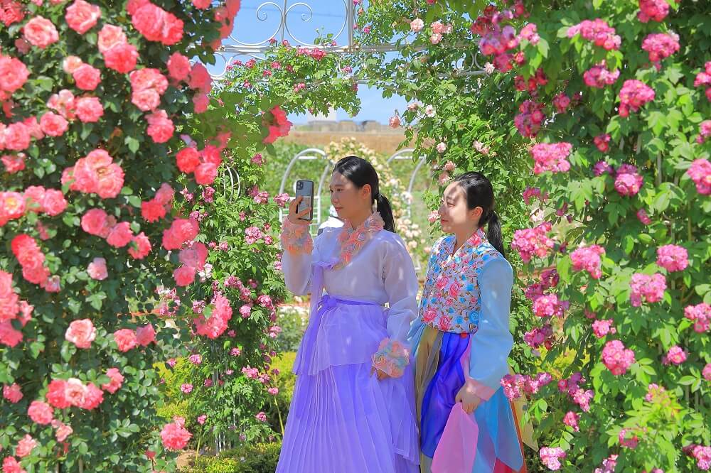 곡성군은 올해 장미공원을 예년의 2배 규모로 확장했고 '세계에서 온 선물'이라는 주제로 시대적 배경과 나라에 따라 다양한 조경 시설물을 설치하고 장미를 심어 이색적인 공간을 조성했습니다.