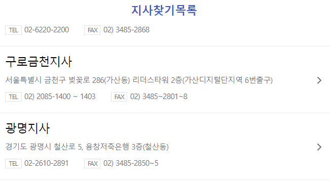 이렇게 지사 찾기를 하고 나면 지사 목록이 나옵니다. 여기에서 해당하는 지역의 지사 전화번호와 팩스번호를 확인할 수 있습니다.
