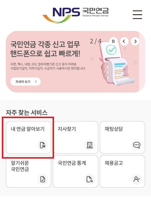 2. 자주 찾는 서비스에서 '내 연금 알아보기' 클릭