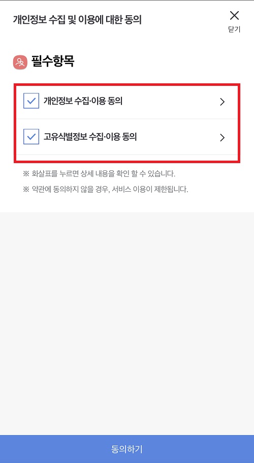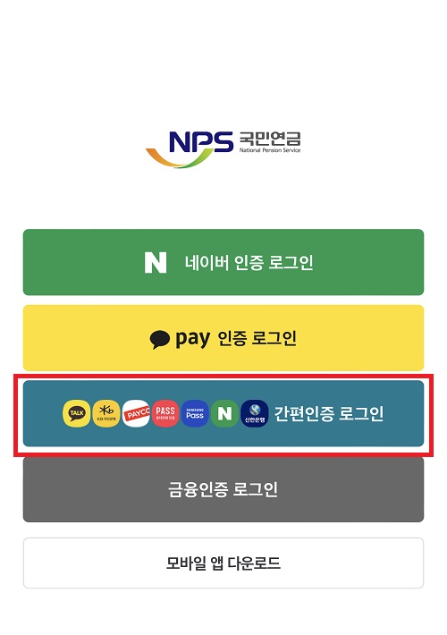 6. 간편인증 화면이 나오면 통신사 패스, 카카오톡, 삼성패스, 네이버, KB모바일인증서, 신한인증서, 페이코 중에서 본인에게 편한 것을 선택합니다. 저는 카카오톡을 선택했습니다.