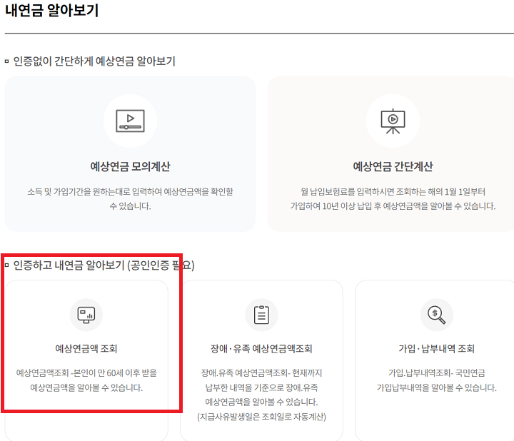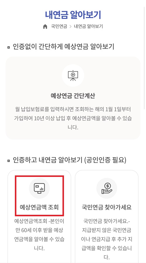 3. '인증하고 내연금 알아보기(공인인증 필요)' 부분 아래에서 "예상연금조회"를 클릭
