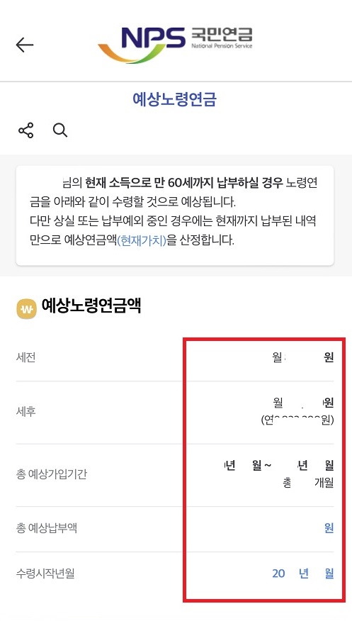 예상노령연금액 아래 빨간 상자 안에 금액이 상세히 나옵니다. (개인정보 삭제함)
