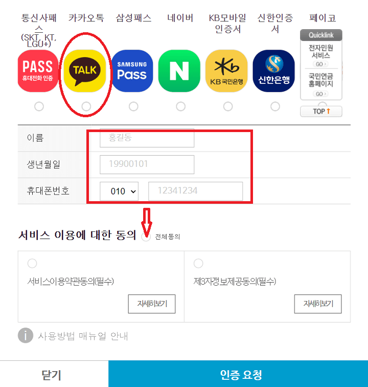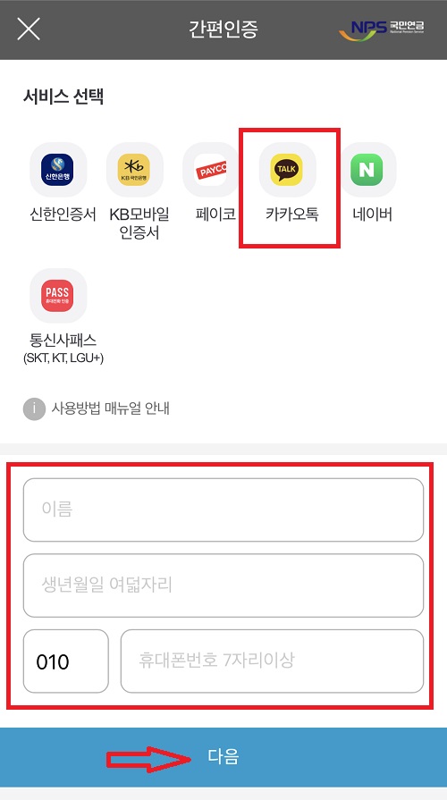 5. 카카오톡 클릭 후 이름, 생년월일 여덟 자리, 핸드폰번호를 입력 후 다음을 클릭
