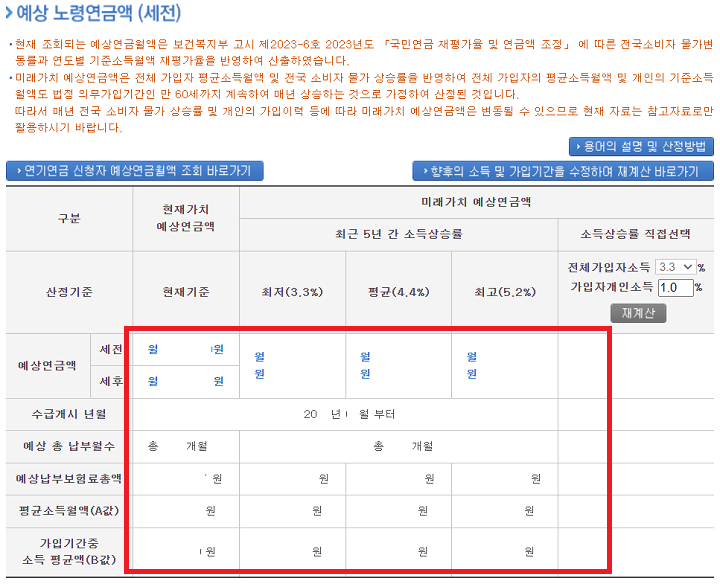현재 조회되는 예상 연금 수령액은 평균 소득월액과 소비자 물가 상승률을 반영하여 전체 가입자의 평균소득월액 및 개인의 기준소득월액도 법적 의무가입기간인 만 60세까지 계속하여 매년 상승하는 것으로 가정하여 산정된 것입니다.