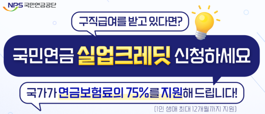실업크레딧제도는 실직한 후에 구직급여를 받는 기간 동안 국민연금 보험료의 75%를 국가에서 지원받을 수 있는 엄청난 혜택입니다. 1인당 생애 최대 12개월까지 지원이 가능합니다.