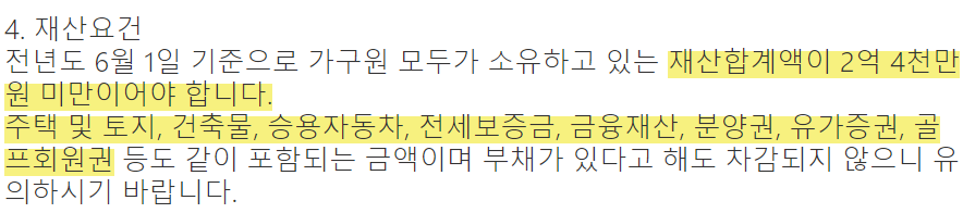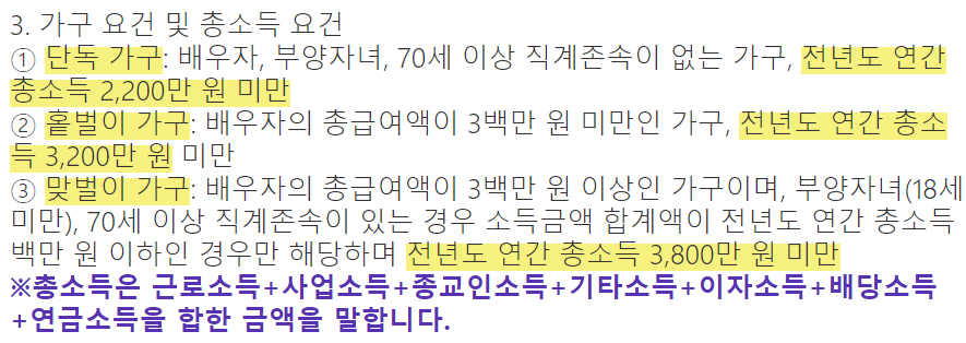 소득 요건은 가구원 구성에 따라 연간 부부합산 총소득금액이 기준금액 이하여야 하고, 재산 요건은 가구원 모두의 소유 재산 합계액이 일정 금액 미만이어야 합니다.
