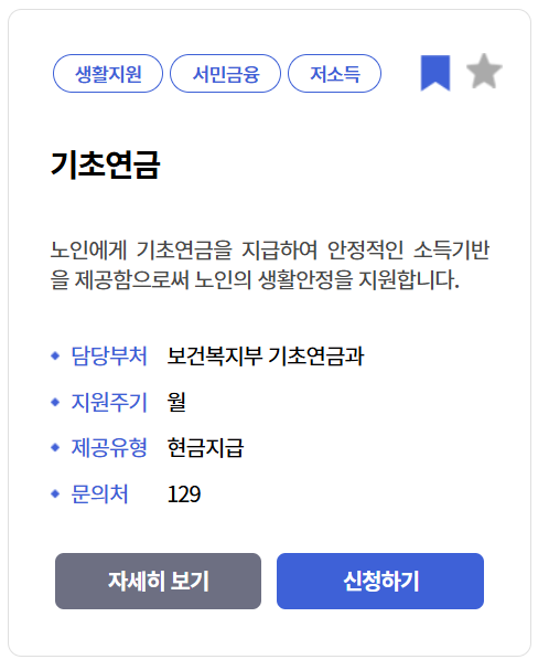 복지로 홈페이지에서 ✅ 복지서비스 ➡ ✅ 서비스 찾기 ➡ ✅ 기초연금 검색 ➡ ✅ 서비스 목록에서 노년 ☑ 체크, 만 나이와지역 선택 ➡ 검색 하면 아래와 같은 기초연금 신청 메뉴가 나옵니다.