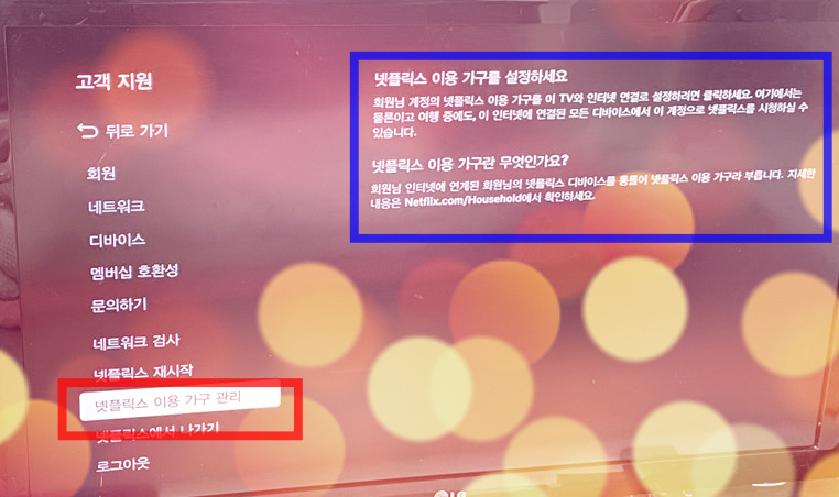 넷플릭스 이용 가구 설정이나 업데이트는 공식 페이지에서 자세히 안내하고 있습니다. TV의 넷플릭스 홈 화면에서 왼쪽 메뉴 하단의 '고객 지원' 탭을 열어 '넷플릭스 이용 가구 관리'를 선택하면 됩니다.