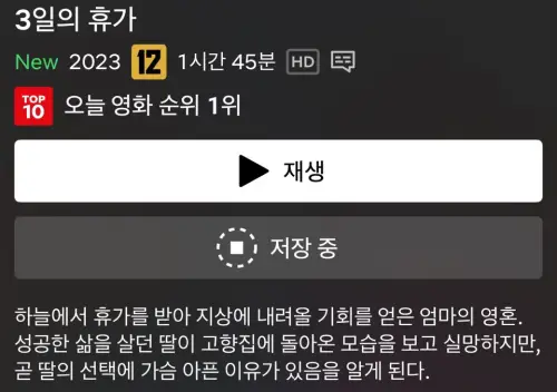 저장한 콘텐츠는 넷플릭스 홈 화면에서 나의 넷플릭스를 클릭하면 프로필 아래에 [저장한 콘텐츠 목록] 아래에서 확인할 수 있습니다. 여기에서 재생을 누르면 와이파이나 데이터를 이용하지 않아도 영상을 시청할 수 있습니다.