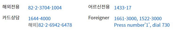 기타 외국인 전용 전화는 1661-3000/ 1522-3000으로 전화하시고 카드 상담전화는 1644-4000으로 전화하시면 됩니다.
