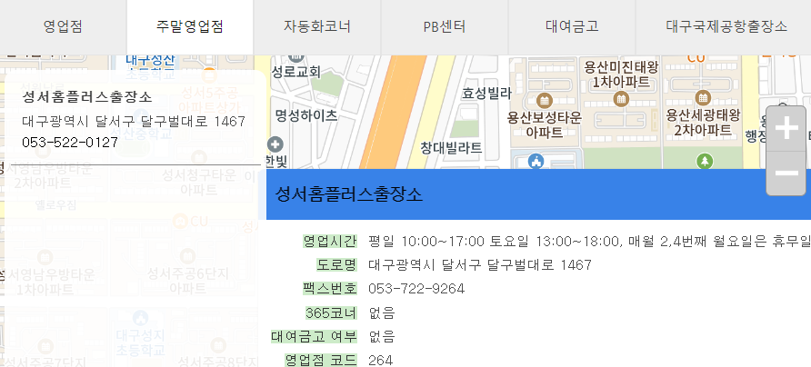 영업점 찾기 화면에서 지역이나 동이름을 입력하고 검색하면 됩니다. 주말영업점을 누르면 주말에 문을 여는 대구은행 지점을 찾을 수 있네요.