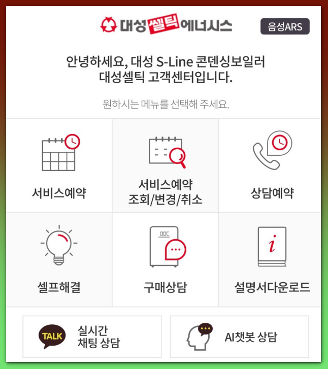 고객센터 전화번호 1588-888로 전화하면 '롯데보일러와 함께하는 대성쎌틱에너시스'라고 나옵니다. 링크 (https://call2.info/f/wJ4EI)가 포함된 문자가 핸드폰으로 오는데요. 그 링크를 누르면 보이는 ARS 서비스 메뉴 페이지가 열립니다.