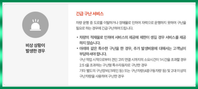 - 구난 작업 소요시간이 1시간을 초과할 경우, 특수 자동차 등으로 구난할 경우 추가 비용이 발생할 수 있습니다.