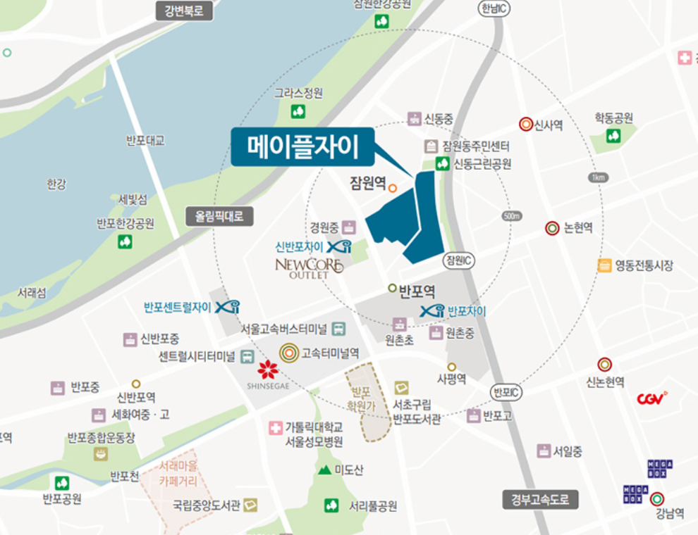메이플자이는 신반포4지구에 재건축하여 지어지는 아파트 단지이니 입지환경을 말하자면 입이 아플 정도지요. 지하철 3호선 잠원역과 7호선 반포역을 동시에 이용할 수 있는 더블 역세권인데다가 서울성모병원, 신세계백화점, 뉴코아아웃렛, 반포한강공원, 고속버스터미널 등의 인프라를 근접거리에서 이용할 수 있는 입지환경입니다.