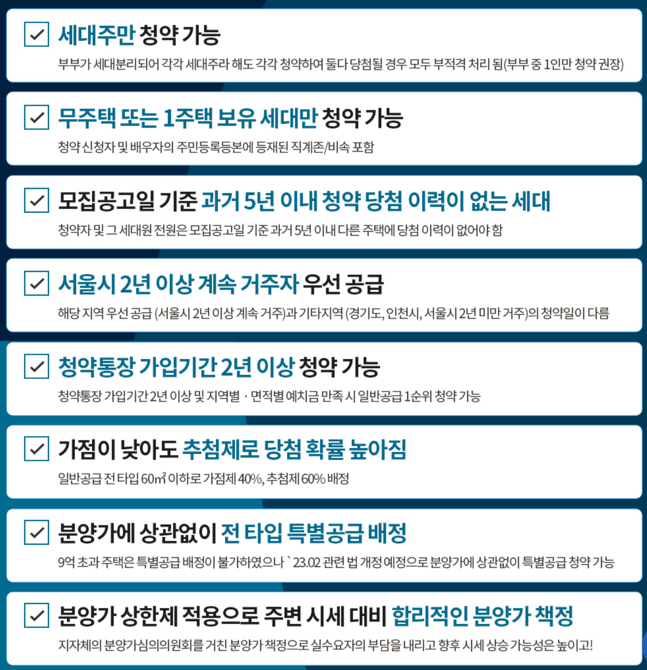 - 무주택 또는 1주택 보유 세대만 청약 가능하며, 주민등록등본에 등재된 직계존/비속도 포함됩니다.