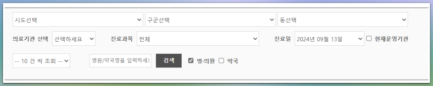 시/도, 구/군, 동을 선택 후 진료일 날짜 선택, 병의원이나 약국 중에서 체크를 하고 검색을 클릭하세요.