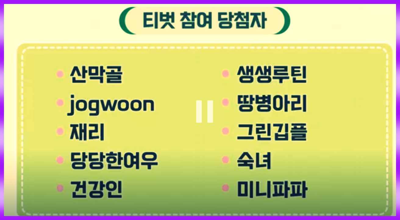 티벗 퀴즈 정답자 중 10명에게 커피쿠폰을 보내준다고 하는데요. 방송 마지막 즈음에 TV 화면으로 티벗 닉네임으로 10명을 발표합니다.