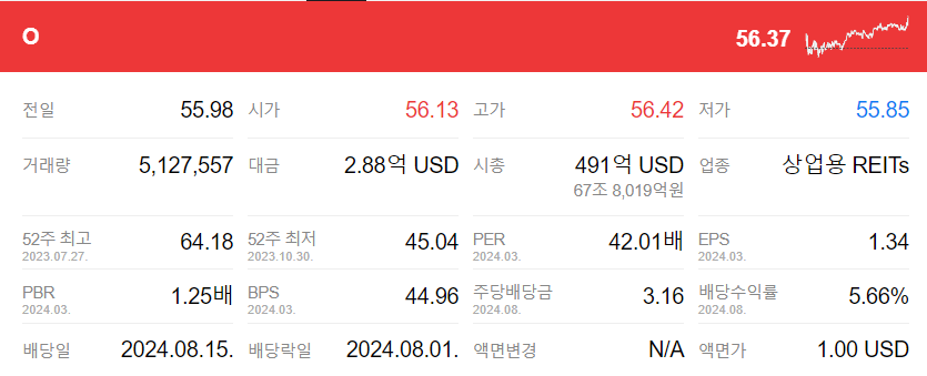- 리얼티 인컴 (Realty Income, O): 상업용 부동산에 투자하며, 월배당으로 유명한 리츠입니다. 현재 배당 수익률은 약 4.4%입니다.