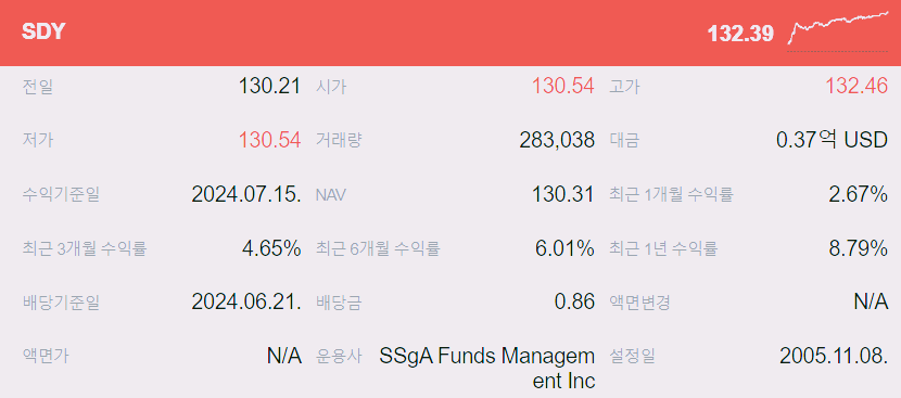 SPDR S&P Dividend ETF의 티커는 SDY로 씁니다. S&P 500 지수 내 고배당주에 투자하며 장기적인 배당 성장을 기대할 수 있는 ETF입니다.