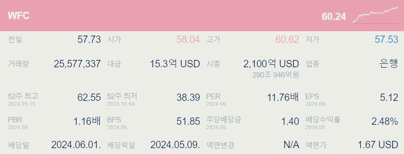 - 웰스 파고 (Wells Fargo, WFC): 대출 및 모기지 분야에서 강력한 지위를 유지하고 있으며, 현재 배당 수익률은 약 4.7%입니다.