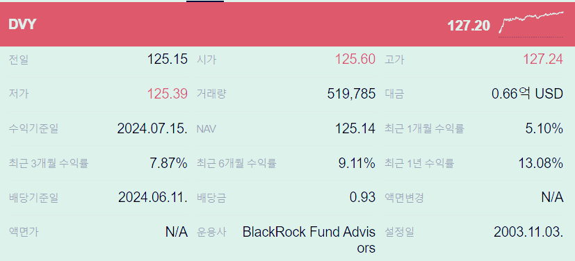 iShares Select Dividend ETF의 티커는 DVY입니다. 안정적인 배당을 제공하는 기업들에 집중 투자하는 ETF입니다.