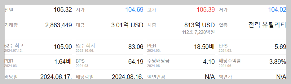 - 듀크 에너지 (Duke Energy, DUK): 듀크 에너지는 전력 및 가스 공급을 담당하는 주요 유틸리티 회사로, 안정적인 배당금을 제공합니다. 현재 배당 수익률은 약 4.1%입니다.