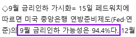 미국 연준의 경제 전망에 따르면, 물가 상승과 실업률 증가가 예상되고 있습니다. 이러한 상황에서 금리 인하는 경제를 부양하고 경기 침체를 완화하는 데 필요한 조치로, 9월에 금리인하가 예상되고 있습니다. 따라서 금리 인하가 단행될 경우 채권과 배당주 시장에 긍정적인 영향을 미칠 것으로 예상됩니다.
