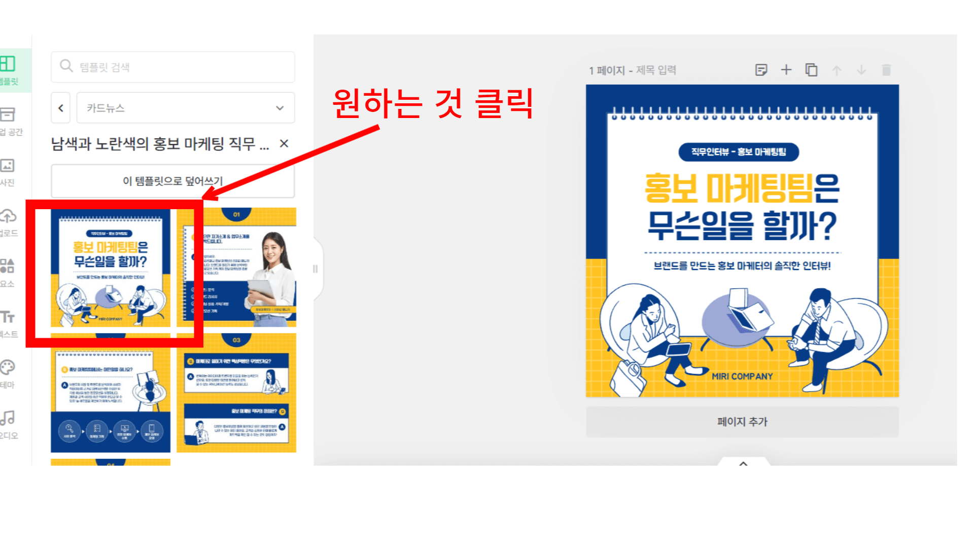 6. 원하는 템플릿을 클릭하면 오른쪽 작업창에 템플릿이 나타납니다.