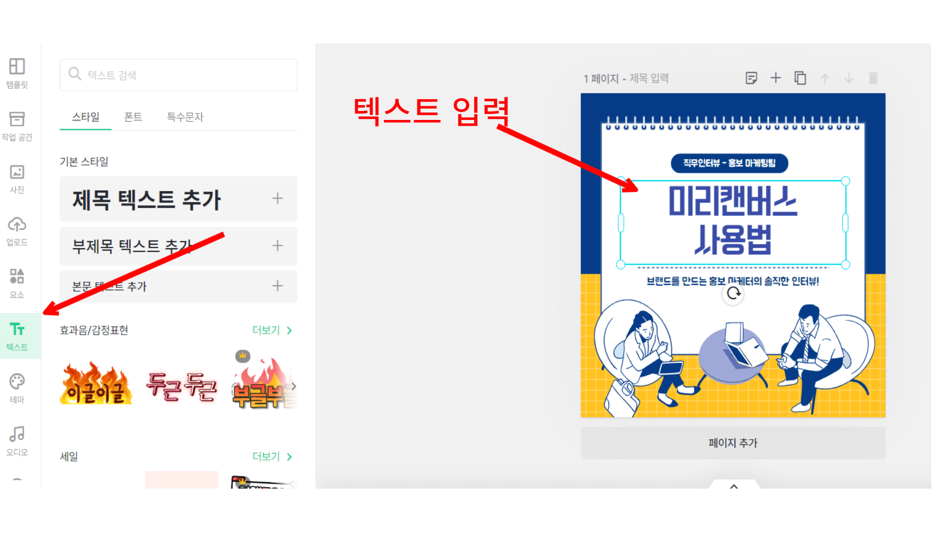 7. 왼쪽 텍스트 메뉴를 누르면 텍스트를 추가할 수 있습니다.