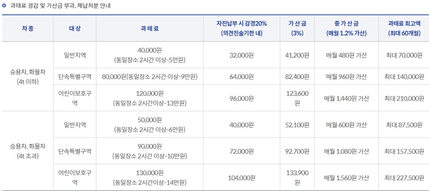 - 어린이보호구역: 2배의 과태료가 가중됩니다. 승용차 12만 원, 승합차 13만 원