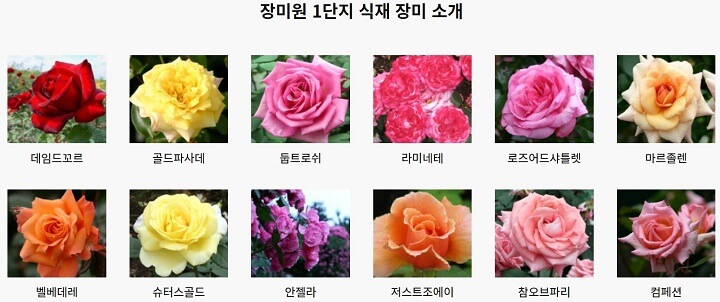 장미원 1~4단지까지 있고 단지마다 심어진 장미의 종류가 다릅니다. 장미꽃 종류 자세히 알고 싶은 분들은 아래 버튼을 누르면 상세보기 페이지로 바로 이동합니다.