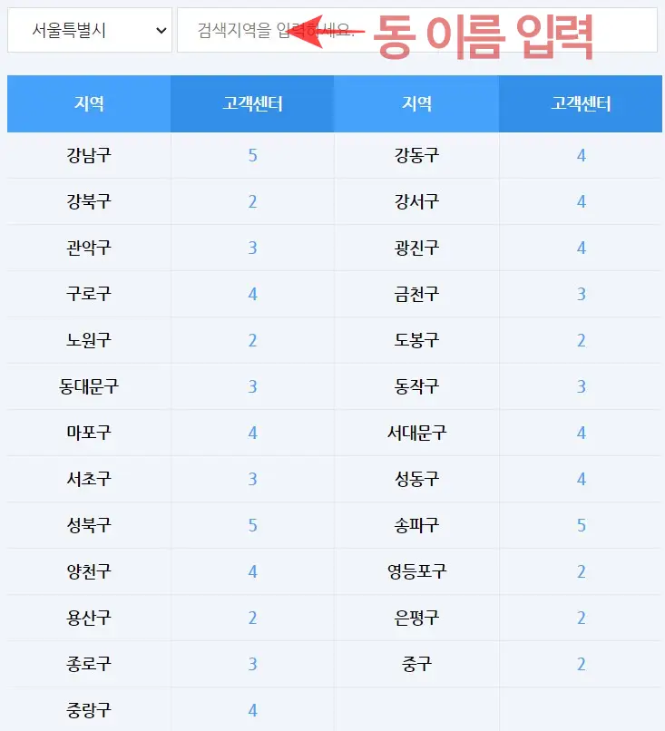 아래에서는 구별로 고객센터를 대략적으로 정리해봤습니다. 내가 사는 동이름이 없다면 위의 서울도시가스 고객센터 찾기 버튼을 이용해서 찾아볼 수 있습니다.