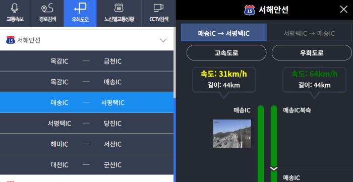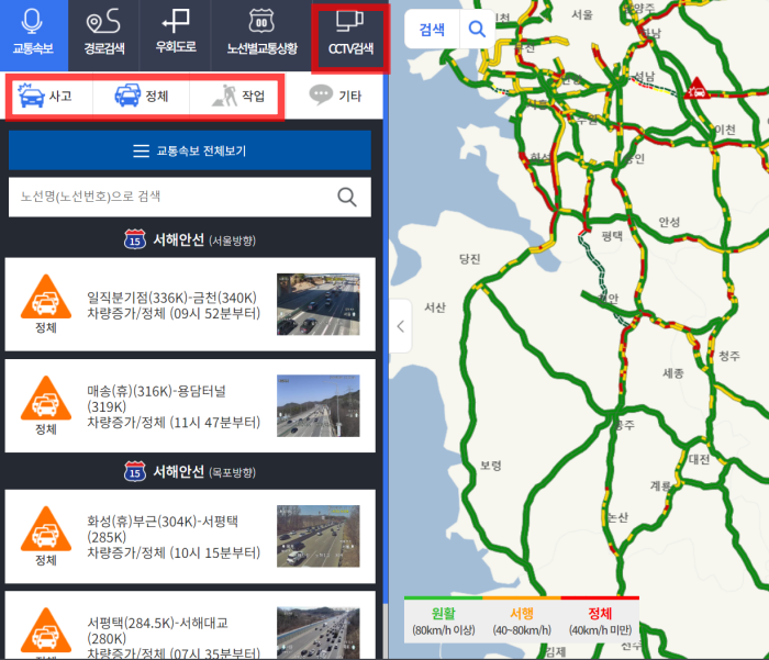 위 버튼으로 이동한 후 첫 화면에서 노선별 교통 상황에서 '서해안선'으로 입력하고 검색하면 됩니다. 그리고 교통속보에서 정체, 사고, 작업중인 구간을 확인할 수 있습니다.