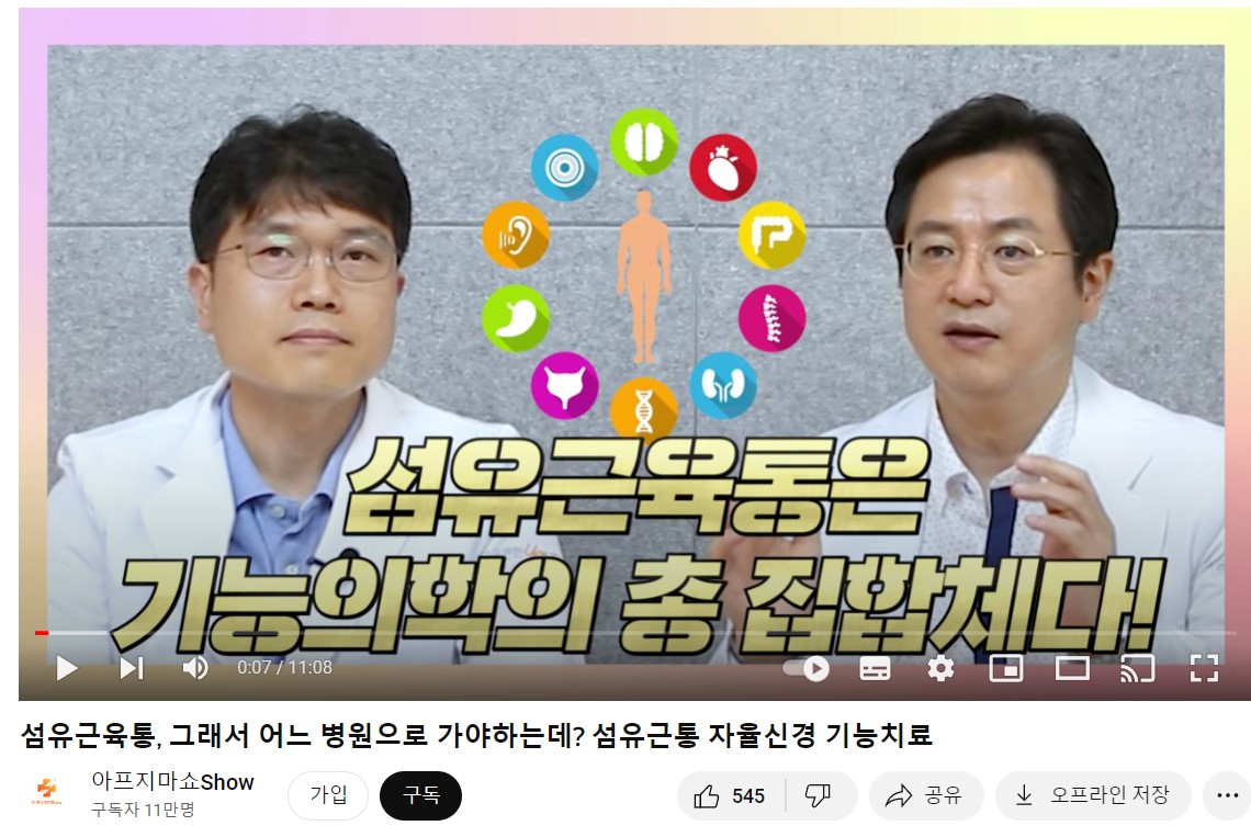섬유근육통이 왜 생겼는지 환자 본인에게 와닿게 설명해 주는 의사를 만나고 객관적 검사를 해주는 병원을 선택하는 것이 중요합니다. 여러 증상(근육통, 불면, 우울감, 두통 등) 중에서 저변에 깔려 있는 공통분모를 찾아 잡아주면 불안정한 부분을 해결하고 부족한 부분을 보충해서 선순환이 일어나면 환자가 생활하기 좀 더 편해질 것이라 생각합니다. (아래 유튜브 내용을 참고하여 정리했습니다. 이미지를 누르면 해당 유튜브로 이동합니다.)