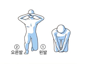 남자는 왼손을 위로 해서 두 손을 눈높이로 올렸다가 바닥을 짚고 무릎을 꿇어 절합니다. 이후 손을 눈높이에 올렸다가 내리며 살짝 목례를 합니다.