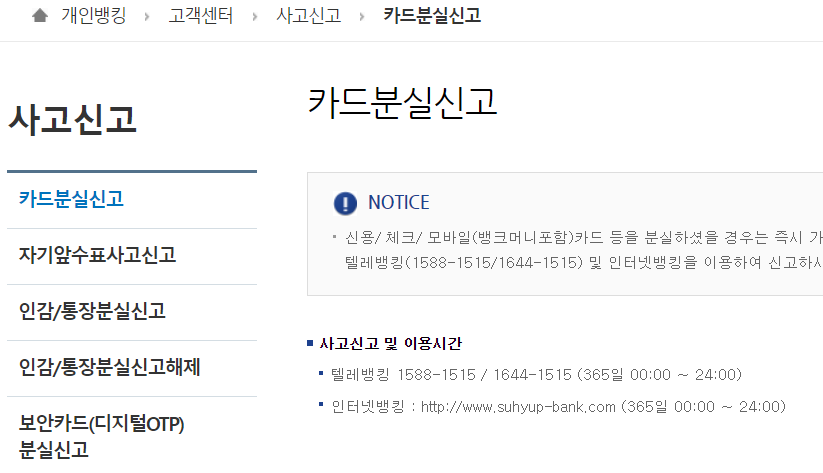 수협은행 홈페이지에서 각종 증명서 발급도 가능하고 분실 등의 사고신고도 가능합니다.