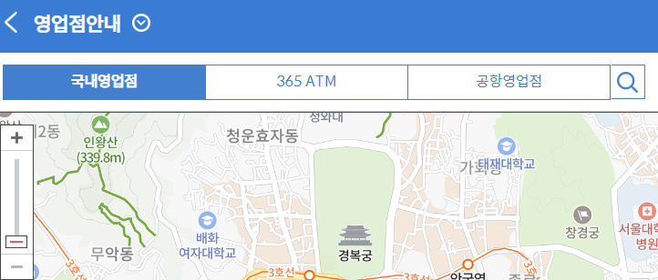 위와 같은 화면이 나오면 돋보기 모양을 눌러 원하는 지역을 눌러 찾으시면 됩니다. ATM 위치도 찾을 수 있으니 낯선 동네에 갈 경우 유용할 것 같습니다.