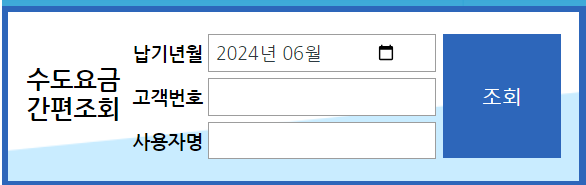 - 정보 입력: 요금 조회 페이지에서 조회하고 싶은 납부년월을 선택하고 고객번호와 수용가명(수도를 등록한 사람)을 입력한 후 ‘조회’ 버튼을 클릭합니다.