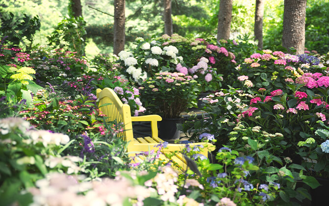 ✔ 유채색 벤치: 아름다운 수국을 보면서 걷다가 벤치에 앉아 잠깐 쉬면서도 예쁜 사진을 남길 수 있습니다.