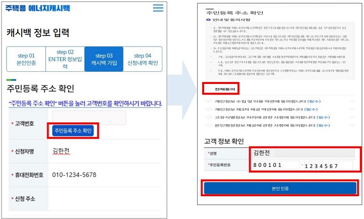 ✔ 고객번호 등록을 위해 '주민등록 주소 확인' 클릭