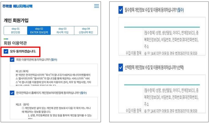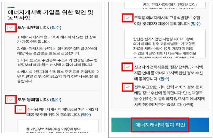 4. 에너지 캐시백 가입을 위한 확인 및 동의 사항 체크, '에너지 캐시백 참여확인' 클릭
