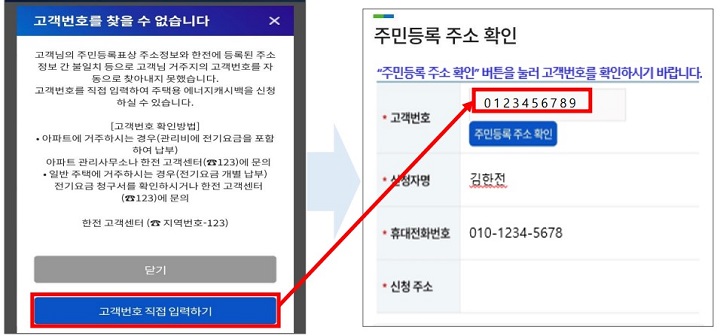 고객번호를 모르는 경우 한전 고객센터(전화 123)로 문의하세요.